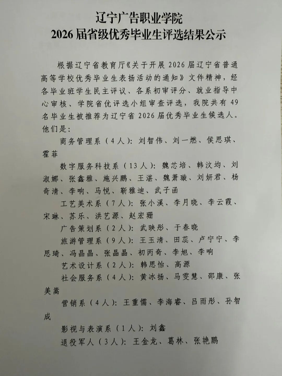 辽宁广告职业学院2026届省级优秀毕业生评选结果公示